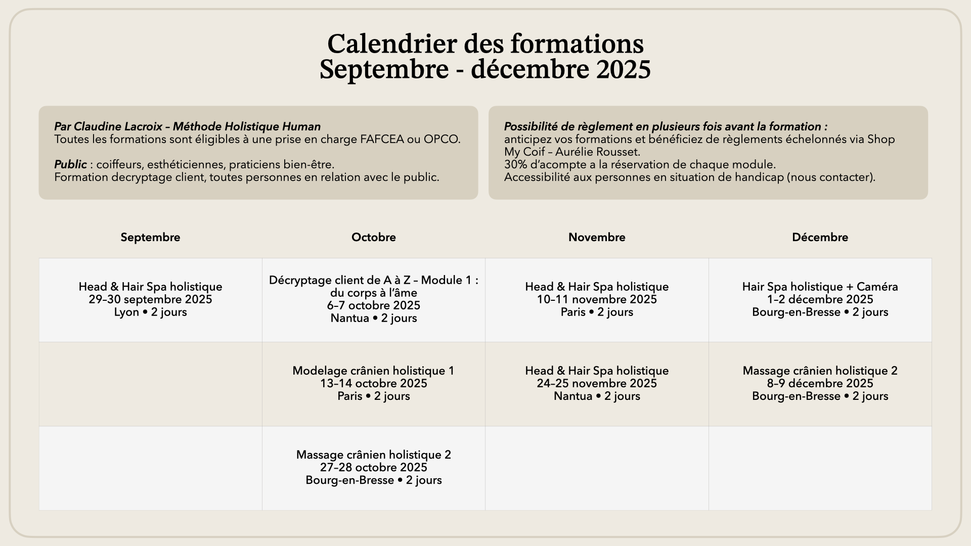 Objectif global : découvrez une expérience holistique révolutionnaire qui associe relaxation profonde, rituels personnalisés et soins capillaires 100% naturels. Grâce à la Méthode Human, vous apprendrez à créer une expérience inédite et haut de gamme, centrée sur la santé du cuir chevelu, la beauté du cheveu et le bien-être global de la personne.